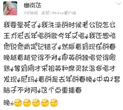 【意外】 @张丽萍:我和爸爸妈妈开了个中央二套看春晚…放的是去年的春晚啊…我们竟然看到现在!!! @那小暖Na-world:发现好多人都看错春晚了 哈哈哈哈哈哈哈哈哈哈哈哈哈 cctv2太坏了