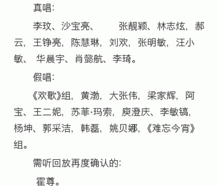【假唱又泛滥了,怎么回事冯导】 鉴定者:@耳帝@梁欢 李玟、沙宝亮、张靓颖、林志炫,王铮亮,郝云,张明敏,是真唱。 汪小敏真唱,肖懿航真唱,李琦真唱。 华晨宇真唱。 庾澄庆、李敏镐是假唱。 目前第一个有技术含量的假唱,孙楠。值得表扬! 阿宝这个节目假唱。 《假唱,倍儿爽!》——大张伟 黄渤假跑加假唱。