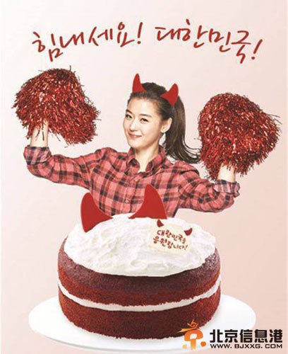 全智贤代言海报 全智贤为代言品牌拍摄世界杯主题海报。该品牌推出了世界杯主题蛋糕,全智贤头戴红魔球迷标志性牛角发卡,变身球迷。 由于世界杯即将举行,韩国的啤酒生产