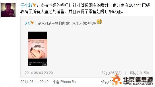 汪小菲微博回应网友质疑 点击图片进入:孙俪晒儿子等等萌照 呼吁抵制狗肉节(图) 今日,大S在微博上转贴呼吁取消广西玉林狗肉节,她写到:“跪求取消玉林狗肉节!求求人类别吃狗”,并说“谢谢不吃小狗的朋友,你们功德无量”。但随后遭到网友吐槽:“你老公开的餐厅里面,鱼翅捞饭388元(人民币,约1830元台币)一份,你先就鲨鱼濒临灭绝的问题表个态,再来说狗的问题。”大S该篇微博吸引1万6千多篇评论,却被重复的“鱼翅捞饭”留言闹版,汪小菲也跟着中枪。 11日上午9点,汪小菲在微博公开回应:“俏江南在2011年已经在整个集团取消了鱼翅的销售,欢迎各位到店里查询,监督。谢谢。”而随后又有网友回应:“我喜欢宠物猪,请不要伤害猪了好嘛!”不知接下来汪小菲又会作何回应。