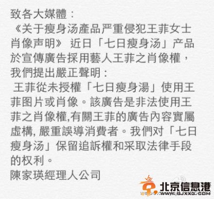 网传王菲代言七日瘦身汤 近日,有媒体报道称王菲之所以身材纤细,被称之为年轻的美少女是因为服用了七日瘦身汤的缘故,并配王菲的照片加以说明。对于此消息,王菲经纪人陈家瑛于6月11日,通过微博向传媒发表声明,澄清王从未授权给某国内品牌使用王菲图片或肖像。 6月11日19点44分,王菲经纪人陈家瑛通过微博向各大媒体发布《关于瘦身汤产品严重侵犯王菲女士肖像》的严正声明全文如下:“近日,‘七日瘦身汤’产品于宣传广告采用艺人王菲之肖像,我们提出严正声明:王菲从未授权‘七日瘦身汤’使用王菲图片或肖像。该广告是非法使用王菲肖像权,有关王菲的广告内容实属虚构,严重误导消费者。我们对‘七日瘦身汤’保留追诉权和采取法律手段的权利。陈家瑛经纪公司。”