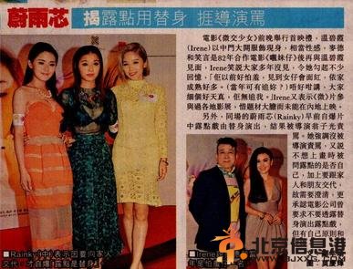 蔚雨芯因露点用替身被导演骂 据香港媒体报道,电影《微交少女》前晚举行首映礼,温碧霞(Irene)以中门大开服饰现身,相当性感,麦德和笑言是82年合作电影后再与温碧霞见面,Irene笑讲大家多年没见,勾起不少回忆,“他以前好怕羞,见到女还会面红,现在成熟好多。(当年可有追你?)不好这么说,大家小时候好天真,他无追我。”Irene又表示《微》片参与过各地影展,惜题材大胆而未能在内地上映。 另外,同场的蔚雨芯(Rainky)早前自爆片中露点戏由替身演出,结果被导演翁子光责骂,又讲不想上映时被问露点的是否自己,加上要跟家人和朋友交代,故需要澄清,更承认电影公司曾要求不好透露替身演出露点戏,但有自己原则和底线。