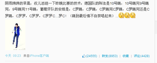 中新网6月17日电17日凌晨,巴西世界杯G组德国队对阵葡萄牙队4:0大胜。身为球迷的郭涛也在微博上分享这场球赛的观后感,他幽默地写道,“阴雨绵绵的早晨,叔儿总结一下昨晚比赛的技术:德国队的阵法是10号踢,10号踢完9号踢完,9号踢完11号踢;葡萄牙队的安排是:C罗踢,C罗踢,C罗踢完C罗踢,C罗踢完还是C罗踢,C罗罗,C罗罗,C罗罗C…罗C(踢到最后情不自禁唱起来)”。