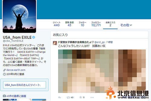 EXILE成员USA收藏了一张不雅照片 近日,据日本媒体报道,日本乐团EXILE(放浪兄弟)成员USA日前被曝在社交网站上收藏了一张不雅图片,引发了网友们的热议。 17日,有网友在USA的官方账号上发现,USA收藏了一条带有不雅图片的推文,随后这条收藏被网友们截图转发,引起了不小的争议。据悉,虽然这条收藏现在已被删除,但这到底是USA本人的操作还是被盗号,目前尚不明确。