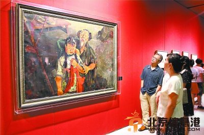 观众在欣赏司徒乔油画《放下你的鞭子》。