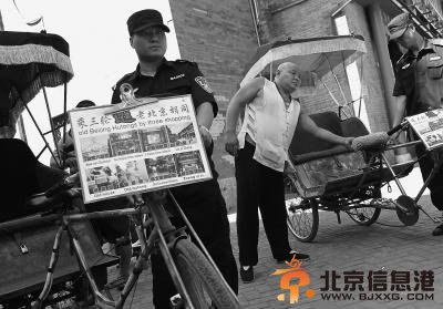 取缔黑三轮黄包车现场。于志强摄 本周,为加强大栅栏地区环境秩序管理,提供有序的旅游、商业、交通环境,西城大栅栏街道办事处、区旅游委及公安、城管、工商等部门组成联合执法队,针对区域内出现的非法人力三轮车、黄包车非法营运及黑导游问题,开展专项整治行动。 昨天上午9点,笔者跟随联合执法队来到珠市口西大街纪晓岚故居附近的一处“集散点”,只见这里有8辆黄包车正停在路边等客,执法人员检查后发现,这些黄包车都没有专门运营的营业执照,而且都是私拼私装,存在很大的安全隐患,最后执法人员对这些黄包车进行暂扣。 随后,联合执法队对琉璃厂东街西口和老舍茶馆附近的非法人力三轮车和黄包车也进行暂扣。截至上午11点,联合执法队已暂扣14辆黄包车、3辆人力三轮车。 阅读完标题为(北京大栅栏地区开展专项整治行动清除黑三轮)的文章后,{www.bjxxg.cn}小编为大家推荐更多相关文章,千万不要错过哦! (责任编辑:北京纪事) |