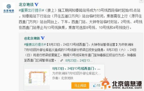 据北京地铁官方微博消息,为尽快消除7月6日因外部仓库起火造成的13号线部分桥梁区段安全隐患,北京地铁公司决定将于8月23日(周六)、24日(周日)进行桥梁修复施工。受此影响,北京地铁13号线西直门站、大钟寺站将临时封站,2号线、4号线在西直门站停止与13号线换乘。 2014年7月6日晚,地铁13号线1号桥44号墩至45号墩桥下外部仓库起火,导致13号线中断运营。火灾造成地铁13号线部分桥梁结构和声屏障受损,给13号线安全运营构成了安全隐患。经充分论证后,北京地铁公司最终确定用8月23日、24日双休日期间进行受损桥梁修复施工。 北京地铁公司称,本次施工将影响13号线正常运营,在施工期间13号线采取东直门站至知春路站区段运行的方式,知春路站至西直门站区间暂停运营,知春路站将成为临时终点站,西直门站、大钟寺站临时封站,2号线、4号线在西直门站停止与13号线换乘。 北京地铁公司提示乘客,如果想乘坐地铁前往西直门地区,也可以选择8号线、10号线和4号线绕行抵达目的地。 据悉,8月23日(周六)、24日(周日),知春路站将为临时折返站,鉴于列车折返作业和信号设备条件限制,为保证安全,施工期间高峰时段行车间隔为5分钟,平峰行车间隔为6分钟。由于车站折返条件所限,知春路站下行(去往五道口方向)站台将临时封闭,乘客在上行(原去往西直门方向)站台采用同台上、下车的方式,也就是说,去往下行(五道口)方向的乘客,也要在上行(原去往西直门方向)站台候车,列车到站后车厢内乘客下车后,候车乘客方能上车。 知春路站上行站台为客运组织的难点,当站台乘客较多、通行受阻时,车站工作人员将视具体情况采取临时限流措施,包括暂时关闭10号线换乘13号线通道口,分批放行乘客;关闭13号线知春路站出入口,分批放行乘客;向行车调度员申请,采取10号线在知春路站临时通过不停车等。 同时,13号线西直门站区也为此制定了一系列应对措施:一是知春路站综控员对每次列车进行接车、发车两次进路的人工办理;二是西直门、大钟寺两站除留守人员外,其他人员均到知春路站支援;三是在知春路站上行站台安排12人值守进行站台客流组织;四是对于想去往大钟寺或西直门的乘客做好迂回线路的指引工作。 此外,回龙观乘务中心为配合知春路折返工作,已将西直门轮乘点临时搬至知春路,并多次进行模拟折返试验,结合知春路站上行站线的具体情况,从列车换头流程、开关门顺序、乘务员交接等环节逐一进行比较,最终确定最为合理、优化的折返及交接作业方案。回龙观维修中心在确保列车维修质量的同时,增派值守人员在知春路站进行车辆全天监控,并组织技术人员在段内值守,发现车辆故障及时处理。 原标题:北京地铁13号线西直门站大钟寺站周六日暂停运营