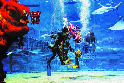 全国首个海洋民俗表演今天在北京海洋馆首次向公众展示,醒狮舞龙同台斗秀,为游客营造了时空穿越般的奇幻享受。据了解,醒狮舞龙表演将于年初一、十五进行,尤其是正月十五,不仅有好看的表演,还有赏水下宫灯、海洋灯谜会等趣味活动,参与互动更有丰富好礼送给游客。 今天上午,伴随着一曲雄浑壮阔的威风锣鼓敲响,海洋民俗表演正式开始,首先映入游客眼帘的是舞狮表演,就在游客欢呼雀跃的时候,潜水员身着喜庆的节日服装跃入水中,在场馆主池内表演起了水中舞龙。展现在游客面前的这条水中蛟龙长3米,外观精美,色彩艳丽,栩栩如生,为环保透水材料特制而成。水中擎珠者和舞龙者交相辉映,陆上醒狮伴游龙,随珠舞动身姿,海洋文化与中国传统民俗创意结合,为游客营造了时空穿越般的奇幻享受。 北京海洋馆总经理胡维勇介绍,来馆的市民还可以看到群星贺岁、鲨鱼家族、海洋十二生肖、海洋好爸爸、爱与新生、另类萌主等主题展,观赏到海豚、海狮、白鲸等联袂献上的新版海洋动物秀。 本报记者 龙露 J029 程功 摄J129 阅读完标题为(海洋馆推出水中舞龙表演)的文章后,{www.bjxxg.cn}小编为大家推荐更多相关文章,千万不要错过哦! (责任编辑:北京纪事) |