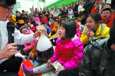 昨天,在中国科技馆,小朋友们在老师的带领下制作干冰“汽水”。本报记者 饶强摄 本报讯(记者 刘欢)参与科学秀场表演、体验古代科技、观看科普大片……春节期间,被称为“科技庙会”的中国科技馆科技大联欢活动人气高涨。初三开馆首日便迎客3.1万人次,初四客流接近4万人次,截至昨天闭馆,大年初三至初五,“科技庙会”三天迎客近10万人次,比去年同期增长近24.5%。 “小朋友们,想不想尝尝用干冰做的汽水是什么味道?”昨天,在科技馆二层的科学秀场表演现场,一位工作人员正在展示奇妙的“干冰”实验。她拿出一个盛满紫色液体的抽滤瓶,加入一块块干冰,一瞬间,瓶子里便腾起一团团白色水雾,小瓶嘴“呼呼”吐起白气。孩子们惊讶地瞪大了眼睛。 “真的是汽水味儿的!”“有点涩涩的”……尝过汽水的小朋友们七嘴八舌地讨论着,“放入-79℃的干冰,水会遇冷起雾,在空气中凝结成小水滴。这就是大家尝到的‘汽水’”。工作人员给孩子们解释着原理。 除了干冰汽水,干冰吹泡泡、干冰瀑布等趣味实验也引得小朋友们一阵阵欢呼。“我们一有时间就会带孩子来科技馆,孩子玩得高兴,还能长知识,一举两得。”一位刚刚拍摄下孩子笑脸的家长说。 华容道、九连环、猜中药……科技庙会中还设置了闯关夺奖的环节,很多市民都是全家总动员,一起闯关。一个古香古色的中药铺前,大小观众们指着一味白色小块的中药议论纷纷。中药前的牌子上写着“味甘、淡、性平,利水健胃”,“这肯定是茯苓!”一位妈妈指点着儿子。只有猜中三味中药才算闯关成功,很多家长都掏出手机,搜索中药知识,帮孩子闯关。 在木版水印展区,小朋友们排队体验,先在木版雕刻上均匀刷一层墨汁,再铺上一张大红色的生宣纸,用大鬃刷来回用力刷两遍……掀开纸,一只仰头傲立的小山羊跃然纸上。8岁的大连小姑娘李月熙举着自己印制的小羊年画,开心地对妈妈说:“妈妈属羊,这个送给您!” 寒假期间,科技馆还特别推出7部全新特效影片和1部寻找外星人的天象节目。其中包括全球首部关于远古大熊猫的4D电影《熊猫与巨猿》和关注濒危动物的《马达加斯加狐猴之岛》等。 据了解,中国科技馆的科技大联欢自2008年春节推出,至今已连续举办八届,深受青少年欢迎。今年的科技大联欢将一直持续到今天。 阅读完标题为(中国科技馆“科技庙会”成少儿乐园)的文章后,{www.bjxxg.cn}小编为大家推荐更多相关文章,千万不要错过哦! (责任编辑:北京纪事) |