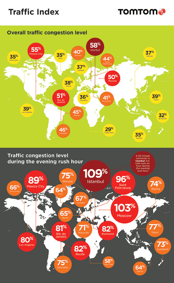 TomTom评出的全球最拥堵城市前3名:伊斯坦布尔(土耳其)、墨西哥城(墨西哥)、里约热内卢(巴西)。 “首都首都,天天都堵。一天不堵,不叫首堵”。这一句耳熟能详的民谣直观地体现了首都人民上下班的艰难困苦。但实际上,北京并不是全球最拥堵的城市。 4月5日,荷兰交通导航服务商TomTom发布了全球拥堵城市排名,北京仅名列第15名。然而,随着中国人均汽车保有量的持续增加,中国的城市可以算是这一名单中的大户,全球最拥堵100个城市中,中国大陆有21个城市上榜。 作为全球著名的导航服务商之一,TomTom每年都会依据其GPS模块上传的数据对全球主要城市的道路拥堵情况进行排名。今年的榜单基于全球35个国家218个城市的测量得出。这份报告称,全球拥堵情况最严重的时段出现在晚高峰。相比不拥堵的情况,车主平均要花费双倍的时间在晚高峰通勤。同时,每周一的早高峰和每周五的晚高峰也是全球道路交通最严重的时段。 报告称,在2014年一整年,所有车主耗在晚高峰堵车路上的时间超过100个小时。 这一报告依据车主因交通拥堵多花时间的百分比来获得各大城市的交通拥堵指数,然后做出排名。今年,全球最拥堵城市是土耳其的伊斯坦布尔。根据报告,伊斯坦布尔的拥堵指数高达58%,这也意味着在拥堵时间,车主平均要比正常行驶多花去58%的时间,而在高峰时间则平均要花去超过一倍的时间,全年伊斯坦布尔民众会浪费125个小时在堵车中。 北京的堵车指数为37%。但值得注意的是,前三十城市中,仅有北京、上海、莫斯科和伊斯坦布尔,高速公路(包括快速路)的拥堵状况比普通公路更加严重。如果将高速公路的拥堵状况做一个排名,北京拥堵率全球第六,紧接着是上海全球第七。 根据这份报告,中国大陆拥堵情况最严重的城市是重庆。 这个上世纪90年代以来快速扩张的城市人口已经翻了三倍。多条河流穿过以及多山地貌导致重庆道路狭窄、桥梁众多。重庆的平均拥堵指数为38%,全球排名第12。而早高峰的拥堵指数高达82%,全球排名第二。 同时,全球拥堵前三十名的城市中,中国大陆有十个城市上榜。 “应对拥堵的传统做法,则是建新的道路,或者扩路,不过都不再行之有效了,”TomTom公司的CEO哈罗德·古迪恩(Harold Goddijn)表示。不用说,他建议,加大实时路况信息服务的传播范围(这正是他的公司所提供的产品),不但有助于司机根据当前路况找到通往既定目的地最快路线,还能为政府提供改善城市交通所需要的数据。 以下是TomTom评出的全球最拥堵城市前三十名: 1. 伊斯坦布尔,土耳其 2.墨西哥城,墨西哥 3.里约热内卢,巴西 4.莫斯科,俄罗斯 5.萨尔瓦多,巴西 6. 累西腓,巴西 7.圣彼得堡,俄罗斯 7.巴勒莫,意大利 8.布加勒斯特,罗马尼亚 9.华沙,波兰 10.洛杉矶,美国 11.台北,中国台湾 12.重庆,中国 13.罗马,意大利 14. 天津,中国 15.北京,中国 16.伦敦,英国 17.广州,中国 18.马赛,法国 19.成都,中国 20.温哥华,加拿大 21.悉尼,澳大利亚 22.巴黎,法国‘ 23.福塔雷萨,巴西 24.上海,中国 25.石家庄,中国 26.旧金山,美国 27.雅典,希腊 28.福州,中国 29.沈阳,中国 30.杭州,中国 阅读完标题为(全球最拥堵城市排行榜:北京位列15 上海第24名)的文章后,{www.bjxxg.cn}小编为大家推荐更多相关文章,千万不要错过哦! (责任编辑:北京纪事) |
