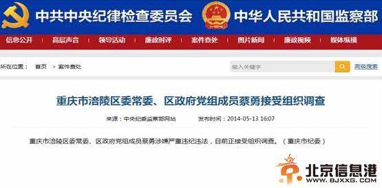 ![]() 据中央纪检监察网13日发布消息,重庆市涪陵区委常委、区政府党组成员蔡勇涉嫌严重违纪违法,目前正接受组织调查。