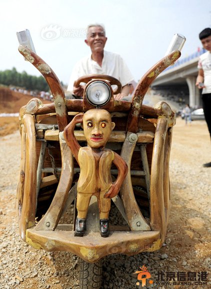 广西柳州66岁老人韦贵荣利用空闲时间,纯手工打造了一辆樟木三轮车。他说主要是为了接送双胞胎孙子,一般电动车只能搭载一两人,买三轮车觉得又不划算,于是就自己动手造了这辆车。图为韦贵荣老人驾驶着木头三轮车,车前脸的木头人眼睛会闪光。唐峰林/东方IC