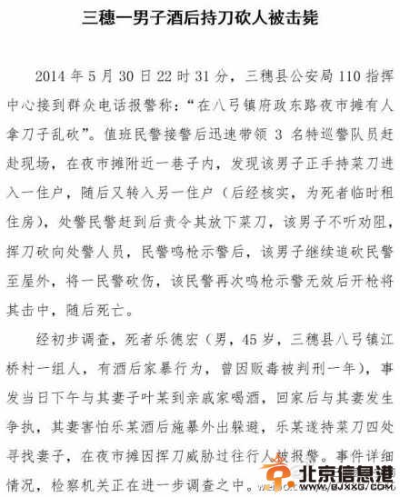 三穗县公安局发布声明: 三穗县公安局:三穗一男子酒后持刀砍人被击毙