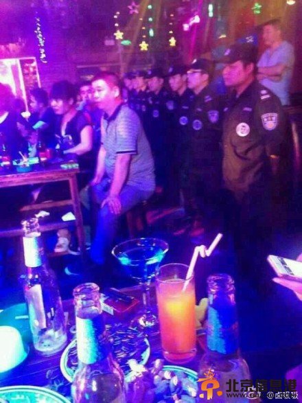 由图片中可以看出,酒吧里面客人坐在桌旁喝酒看节目,身后是一排站着的警察,目前该图片真假尚未可知。