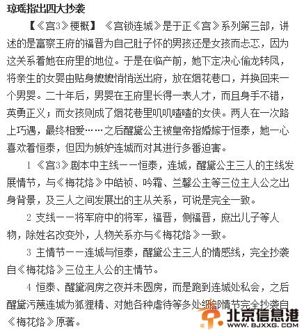解析于正版《宫锁连城》涉嫌抄袭《梅花烙》四大情节 【琼瑶控诉于正《宫锁连城》抄袭细节,称被气病】 昨天,琼瑶在微博上贴出了一封写给广电总局领导的举报信,称于正抄袭其作品,一时间引发网友轰动。在信中她指出,于正编剧的《宫锁连城》(《宫3》)严重抄袭其作品《梅花烙》,并一一列举其抄袭的几个部分。琼瑶在长文中表示,《宫3》主角人物抄袭,情节关系以及支线人物关系都与《梅花烙》一致…… 琼瑶的公开信语气严厉,表示自己都被气病了,“一气之下,已经病倒。手边的工作,也完全停止。”但琼瑶仍然坚持要讨回公道,“可否让这部抄袭侵权的作品,即时停止播出!” 阅读完标题为(那些年于正抄过的电视剧 于正抄过的电视剧盘点(2))的文章后,{www.bjxxg.cn}小编为大家推荐更多相关文章,千万不要错过哦! (责任编辑:北京信息港) |