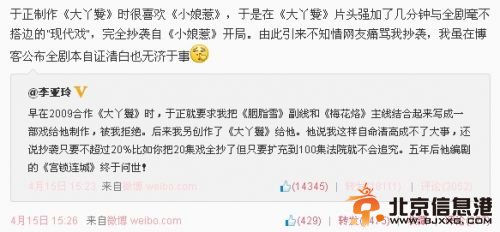 【编剧声援 李亚玲:于正曾让我抄袭《梅花烙》】 琼瑶昨天向广电总局发出的举报信引发观众对于正作品的热议。不少网友认为,于正似乎已不是第一次抄袭,以往在湖南卫视热播的《宫1》和《宫2》(观剧)以及在江苏卫视热播过的《山河恋之美人无泪》都有疑似抄袭的现象。 另外,曾与于正合作过的编剧李亚玲昨天发微博揭发:“早在2009年合作《大丫鬟》时,于正就要求我把《胭脂雪》副线和《梅花烙》主线结合起来写成一部戏给他制作,被我拒绝。后来我另外创作了《大丫鬟》给他。他说我这样自命清高成不了大事,还说抄袭只要不超过20%,比如你把20集戏全抄了但只要扩充到 100集法院就不会追究。5年后他编剧的《宫锁连城》终于问世!” 阅读完标题为(那些年于正抄过的电视剧 于正抄过的电视剧盘点(3))的文章后,{www.bjxxg.cn}小编为大家推荐更多相关文章,千万不要错过哦! (责任编辑:北京信息港) |