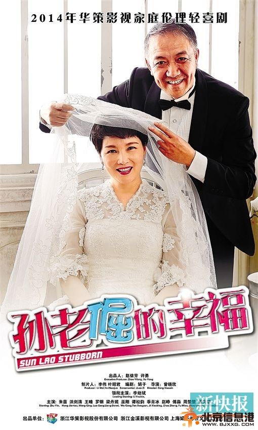 《孙老倔的幸福》海报 华策家庭温暖轻喜剧《孙老倔的幸福》昨日下午邀请媒体探班并首度曝光海报,主演李幼斌、朱茵、洪剑涛、王晴、罗刚、梁丹妮、谭松韵、季肖冰、赵峥、傅淼、周楚楚、傅天骄等亮相。“李云龙”李幼斌这次变成“倔老头”还有点萌,被人爆料戏外能玩能闹爱聊天,他则嫌弃自己还是“不够老”,想要更“老态”。 《孙老倔的幸福》以孙老倔“一家之长”与50后亲家、60小舅子、70后子女、80后侄女、90后孙辈之间斗智斗勇。以“李云龙”一角被观众奉为国民英雄的李幼斌变身可爱的孙老倔,操心完了侄女的婚事,为孙女的恋爱开展了家庭抗战,还为抱上孙子里外忙乎,这期间闹出了不少笑话。戏里李幼斌饰演的孙老倔为了拉近与90后孙女的距离,还主动学起了玩微信,唱起了流行歌曲十分搞笑。导演曾晓欣透露李幼斌总担心自己不够老,还会问“我是不是不显老啊”。 现场曝光的海报正是李幼斌与朱茵的结婚照,戏里饰演孙老倔妻子的朱茵透露李幼斌到现场时腿也弯了,背也驼了,一天都会保持这个状态来找“老态”的感觉,也表示整天和李幼斌开玩笑,拍结婚照那场戏时更是搞笑。“选了店里最大的婚纱没套上,看来岁月不饶人。没想到李幼斌掀起我的盖头说我是‘老妖精’。”不过朱茵也表示两人因为演老伴才开得起玩笑,平时自己也喜欢被称作“刺儿”的他,但自己拍完这部戏感觉自己“老了30岁”。