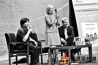 希勒夫妇 本报讯 日前,2013年诺贝尔经济学奖得主罗伯特-希勒夫妇现身首都图书馆,为家长们带来了一场育儿讲座。罗伯特-希勒的夫人维吉尼亚-希勒是著名的心理学家,著有《奖励出好孩子》一书。谈到中国现在大热的诸如《爸爸去哪儿》等各种亲子真人秀,希勒坦言不建议小孩参加电视真人秀,“面对摄像镜头,不管是成人还是小孩都会紧张,特别是小孩,容易产生心理问题,因此不建议小孩参加电视真人秀”。 罗伯特-希勒是耶鲁大学经济系著名教授之一,2013年获得诺贝尔经济学奖。他的太太维吉尼亚-希勒是医学博士,临床心理学家,专门从事儿童及家庭心理治疗,著有《奖励出好孩子》等书,该书日前已经由重庆大学出版社引进。日前,希勒夫妇携《奖励出好孩子》一书来到首都图书馆与大家分享育儿之道。 罗伯特-希勒夫妇所崇尚的“奖励式”育儿方式,也有需要特别注意的地方,“奖励和收买,就如同我们常说的天才与疯子之间的距离一样,需要特别认真地把握”。希勒夫妇举了一个简单的例子,父母带着孩子逛超市,孩子不停地哭闹。此时,妈妈说,“如果你停止哭闹,我就给你买好东西”。“这就是收买,而非奖励。”希勒夫妇认为,按照他们理解的正确的“奖励”教育应该是,在进入超市以前,你就对孩子说,“如果你在购物车上坐好,不哭不闹,你就会得到奖励,我们可以在回家路上顺便去趟公园玩”。 很多父母虽然知道“奖励”式教育的重要性,但他们的所谓奖励其实是收买。比如,帮妈妈打扫一间屋子,就奖励5元,很多时候父母把奖励变做用金钱、财产、利益来诱惑孩子。希勒夫妇所崇尚的“奖励”,“要根据孩子的实际能力,确定实际目标,你可以让一个6个月的孩子试着站起来,但不可能让一个3个月的孩子也自己站起来”。此外,希勒夫妇提倡的“奖励”更侧重人际交流,“在给予孩子的奖励中,应该更多地尝试使用人际交流的奖品,比如,去公园玩、星期五晚上可以晚睡觉、允许孩子邀请朋友到家里玩、和朋友去看电影等等”。