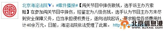 北京海淀法院微博截图 23日下午,北京海淀法院官方微博称,某闯关节目中有选手摔伤致残,已对主办方提起诉讼并要求索赔,“在参加闯关节目中摔伤,经鉴定为八级伤残。选手认为节目主办方未尽到安全保障义务,应当承担侵权责任,遂向法院起诉,要求赔偿各项费用共计40余万元。日前,海淀法院依法受理了此案。 ” 据北京海淀法院官方微博消息,原告张女士诉称,2013年7月28日,其在参加中国农业电影电视中心主办的闯关栏目《阳光大道——为你喝彩》的录制过程中,闯关失败后摔在气垫上,致使多发肋骨骨折、腹部闭合性损伤,后经鉴定为八级伤残。 张女士认为节目主办方在选手闯关过程中未尽到安全保障义务,造成自己摔伤致残,应当承担侵权责任。在就责任归属及赔偿问题与节目主办方协商未果后,张女士向法院起诉,要求节目主办方赔偿医疗费、精神损害抚慰金、误工费、护理费、交通费、残疾赔偿金等共计40余万元。目前,此案正在进一步审理中。
