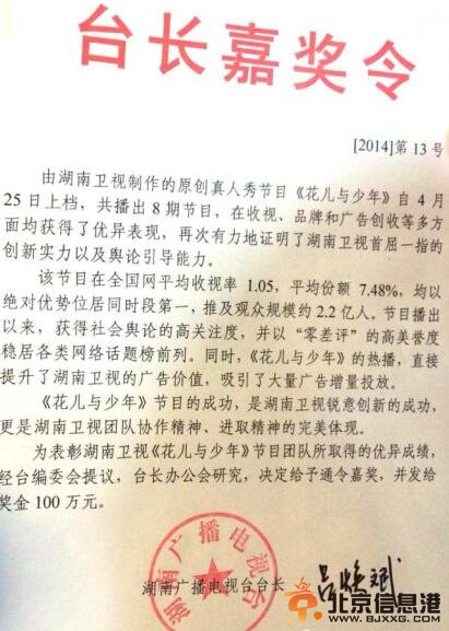 人民网北京6月23日电 据湖南卫视《花儿与少年》官方微博消息,湖南广播电视台台长吕焕斌主持召开了湖南卫视《花儿与少年》嘉奖大会,向《花儿与少年》节目组颁发了台长嘉奖令,并发给奖金100万元。
