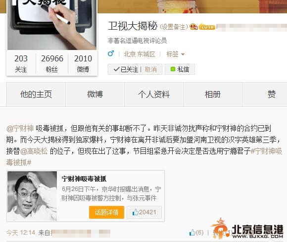 微博爆料截图 凤凰网娱乐讯 6月27日中午,微博用户卫视大揭秘爆料:宁财神因吸毒,在被江苏卫视《非诚勿扰》抛弃后,与河南卫视的合作恐怕也要告吹。该台本计划邀请他担任第三季《汉字英雄》的嘉宾,但在他出事后,节目组紧急商讨是否继续选用他。 就此消息,凤凰娱乐向河南卫视求证。据该台总编室工作人员透露:“听节目组说,《汉字英雄》第三季在筹备阶段确实有邀请宁财神担任嘉宾,而且双方谈得很愉快,但后来节目组经过综合考虑,决定选择刘震云为嘉宾。”不过,当被问及做出这个决定的的具体时间是在26之前还是之后时,该工作人员并没有正面回答。 此外,凤凰娱乐亦连线了河南卫视品牌推广部主任张先生,他证实并透露:“宁财神不会参与《汉字英雄》的录制,著名编剧刘震云接替高晓松担任嘉宾,此外还将有一位文艺圈重量级大佬加盟。””