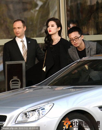 刘亦菲浓妆艳抹拍戏 刘亦菲变身时髦女郎 2014年05月30日,上海,近日,刘亦菲、王学兵、rain在某酒店门口拍戏。王学兵开车奔驰车,下车挽着刘亦菲走进酒店。屌丝男rain坐