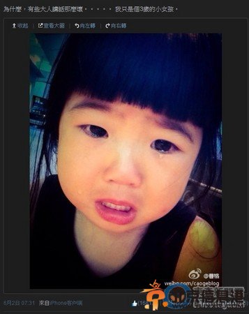 曹格女儿痛哭 中新网6月3日电 据台湾媒体报道,歌手曹格经常在社交网站分享5岁儿子Joe和3岁女儿Grace的生活照,近期还带着两个孩子参加湖南卫视《爸爸去哪儿2》的录制,但女儿却饱受网友批评,3日,他在微博放上女儿哭泣的照片,并留言“为什么有些大人讲话那么坏,我只是个3岁的小女孩”。 曹格女儿总是顶着厚刘海发型,但浓密的眉毛经常让她的表情看起来很搞笑,曾被网友形容像“蜡笔小新”,并引来网友留言批评她的外貌。 2日早上,曹格在微博上传一张女儿泪眼汪汪的照片,并写道:“为什么有些大人讲话那么坏,我只是个3岁的小女孩。”让网友相当不舍,留言安慰:“不要在意那些人了,小孩子嘛!童真就好。”、“女大18变,咱长大一定会变漂亮的!”