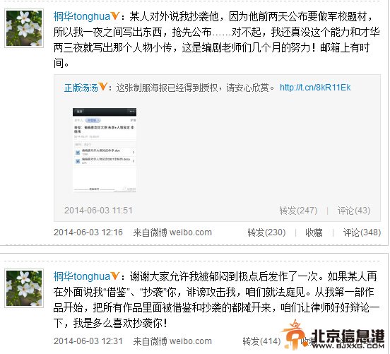 桐华微博截图 日前,于正《宫3》因被指抄袭琼瑶《梅花烙》,被琼瑶告上法庭。一波抄袭未完,领一波抄袭又起。前集体,于正在微博上为自己的新剧热身,因与言情小说家及编剧桐华新剧都涉及新剧热血军校题材,今日上午,其工作室写手@潇湘冬儿与桐华在微博互指对方剽窃创意,展开隔空对掐。 6月2日,桐华在微博上发布了她的新剧项目《偏偏喜欢你》的剧作理念和人物小传,6月3日上午,于正发表一条微博:“@于正工作室+@潇湘冬儿-sunshine+@陈晓+民国热血军校=期待否?”然后还配了一张军服型男的网络图片。两者颇有些相似。 之后,于正网络作家潇湘冬儿10点48分发微博道指桐华抄袭:“鉴于有些原因,这事我多说一句,这部作品筹备已久,关注我微信朋友圈的同学可能早有发现,里面的内容到时候大家一看就会知道那是我的东西,无需多言。本来想开机再发布消息,今日说这些实属无奈之举,有时候抢先说话不代表什么,只是想据为己有,我是新人,但我不好欺负,我啥都敢说,我光棍的很。”这条微博也得到于正的转发支持。 桐华12点许连发微博,先晒出邮件截图,图上显示早在三月、四月的时候,他们就沟通过《偏偏喜欢你》的故事情节,称:“某人对外说我抄袭他,因为他前两天公布要做军校题材,所以我一夜之间写出东西,抢先公布……对不起,我还真没这个能力和才华两三夜就写出那个人物小传,这是编剧老师们几个月的努力!邮箱上有时间。 ”最后的一张制服海报还真与于正晒出的不谋而合。 12点31分,桐华继续发文写道:“谢谢大家允许我被郁闷到极点后发作了一次。如果某人再在外面说我“借鉴”、“抄袭”你,诽谤攻击我,咱们就法庭见。从我第一部作品开始,把所有作品里面被借鉴和抄袭的都摊开来,咱们让律师好好辩论一下,我是多么喜欢抄袭你!”凤凰娱乐在进一步关注中。
