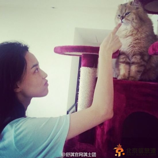 舒淇教训爱猫 6月3日22点51分,“舒淇粉丝团”官方微博曝光一张舒淇训猫的搞笑照片,并以舒淇的口气写道:“再不睡下场和mmb一样!”照片中,舒淇爱猫站在高高的桌上,一脸无辜的表情看着女主人,舒淇披着头发,满脸的愤怒,双眼瞪得大大的,右手指着不睡觉的猫咪,将她完美的表演天赋展现的淋淋尽致。