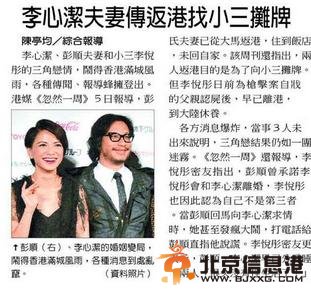 李心洁夫妇返港找小三摊牌 据香港媒体报道,李心洁、彭顺夫妻和小三李悦彤的三角恋情,闹得香港满城风雨,各种传闻、报导蜂拥登出。港媒5日报导,彭氏夫妻已从大马返港,住到饭店,未回自家。该媒体还指出,两人返港目的是为了向小三摊牌。但李悦彤日前为枪击案自杀的父亲认尸后,早已离港,到内地休养。 各方消息爆炸,当事3人未出来讲明,三角恋结果仍如一团迷雾。媒体还报导,李悦彤密友指出,彭顺曾承诺李悦彤会和李心洁离婚,李悦彤也因此认为自己不是第三者。当彭顺回马向李心洁求情时,她甚至发疯大骂,打电话给彭顺直指他讲谎话。李悦彤密友更表示,彭顺、李心洁早已分房睡,两人“很久没性生活了!”
