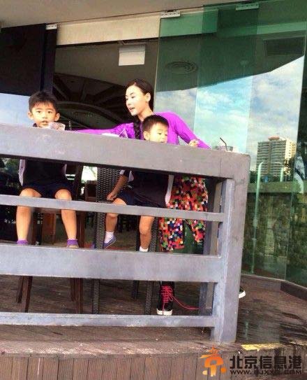 6月6日,微博上一位居住在新加坡的网友发文称,她的朋友去东海岸喝茶,巧遇张柏芝及其两个儿子。从照片上看,张柏芝身穿舒适修身的紫色花上衣、松松垮垮的马赛克图案短裤,一条麻花辫也显得轻松休闲。两个儿子Lucas和Quintus穿着一模一样的兄弟装,在妈妈的看护下乖乖吃着东西。
