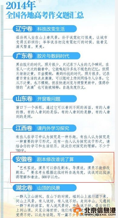 高考作文题目部分截图 2014年6月7日上午12点许,全国高考第一科语文结束,各地作文题汇总火热出炉!而安徽的高考题目取材于娱乐新闻,以数月前宋丹丹和编剧的剧本之争为北京,让学生谈理解和看法。 2014年安徽高考作文题目为材料作文,大致意思:“一位艺术家认为演员在表演中有些剧本内容是可以自由发挥稍作修改的,追求一定的艺术性,而剧本的原作者执意认为内容不可以做修改,要尊重原作者的意思,必须按照原剧本的内容进行表演”,考生根据材料内容阐述自己的观点,可以议论,也可以记叙,题目自拟, 写一篇不少于800字的文章。”该题目正是今天上半年引起娱乐圈热议了“演员和编剧改剧本之争”事件。