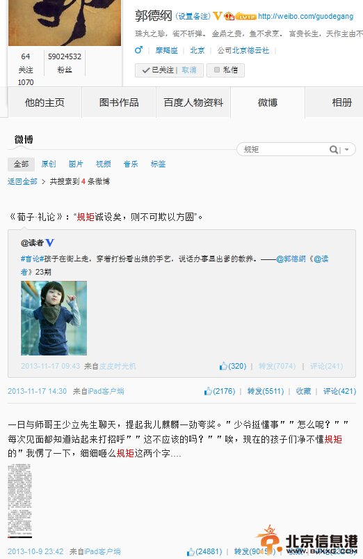 郭德纲微博截图 2014年6月7日,又是一年高考日,上午11点半许,今年北京高考作文内容曝光,分为微作文和大作文,大作文题目则是“老规矩”,而巧的是,去年10月,相声演员郭德纲发布的一条关于“规矩”的长微博,引发网友热烈讨论。该微博当时引起市民热议,有人受访中认为一些二三十岁的年轻人后缺失“规矩教育”,应该加强引导。 并且郭德纲有关规矩的这条微博,引起的转发量高达74000多次,被评论22000多次,获得两万多个赞扬。 不知是北京高考作文受到了郭德纲的启发,还是郭德纲碰巧命中了作文。 今日是2014年高考第一天,上午第一个语文考试结束,北京高考作文题目曝光——老规矩。分数50分。题目称:“北京过去有许多老规矩,例如:“出门要跟长辈打招呼”“吃饭不许满盘子乱挑”“笑不露齿、话不高声”“不许管闲事儿”……随着时代的发展这些老规矩逐渐被人淡忘,不久前又有网友把这些老规矩整理到网上,引起网络热议,来~一起说说你记忆中北京的老规矩吧~” 然而巧合是,去年10月10日,相声演员郭德纲以儿子郭麒麟的事为由头,讲起了规矩。文章写道““人活一世要有规矩。全家人围坐用餐,大人不动孩子不能动;吃饭坐哪就不能再换,端着碗满处跑那是要饭的。不许用筷子敲盘碗,这有乞丐之嫌……”内容和北京高考作文题目颇为相似。网友看后,一边倒力挺他:“老郭这次说得有道理!”这条开讲规矩的微博当时一经发出,短短一天时间,转发量就超过4.5万次,评论也达到1.2万次,可谓一度引起了社会热议。不知高考命题组是否参考了这一社会热点议题。