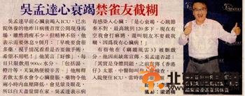 吴孟达现身消瘦不少 据香港媒体报道,吴孟达早前心脏衰竭入ICU,已出院休养的他昨日病后首度公开现身马场,虽然消瘦不少,但精神不俗,他表示需要休息9个月: “早晚要吃很多药,看情况是否要做手术,希望不用吧!”他笑言“好惨”,每日只限喝用900cc水分。“包括汤、橙汁等,天气热便较辛苦。”他解释若和太多水会令心脏发胀,药物令他两小时内血压降低,会见晕及眼花,所以日头尽量留在家。吴孟达表示病毒感染入心脏: “是心衰竭,心跳节奏不对,最高跳到120多下。现在得闲我会打麻将,还叫朋友不要截我糊,因为我有心脏病!”