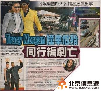 崔西遇车祸 据香港媒体报道,曾与动作巨星布斯韦利士(Bruce Willis)合作拍片的电视剧《娱乐揸Fit人》(30 Rock)美国谐星崔西-摩根Tracy Morgan,前日凌晨于新泽西州发生6车连环相撞车祸,其乘坐的豪华巴士被货柜车碰撞,Tracy情况危殆,意外酿成1死7伤。 大前晚于特拉华州多佛举行《Turn It Funny》巡回的Tracy,乘坐豪华巴士往下一站北卡罗来纳州,凌晨1时于新泽西州公路被后面隶属百货公司的货柜车碰撞,巴士翻侧导致六车连环相撞。当时豪华巴士内有6人,62岁喜剧编剧James McNair当场死亡,Tracy重伤危殆,其助手Jeff Millea、谐星Harris Stanton与Ardie Fuqua亦告受伤,他们由直升机送往Robert Wood Johnson医院。意外中共1死7伤。据称导致意外的35岁货柜车司机Kevin Roper驾驶时打瞌睡,他被控1项驾车杀人与4项驾车伤人罪,保释金为5万美元(约39万港元)。 幸未婚妻及女儿未有同行 Tracy未婚妻Megan Wollover的母亲Christine Wollover受访时表示:“当听到Tracy遇意外的消息,实在大受打击,感到难以置信。当时我祈祷希望女儿Megan与11个月大的孙女Maven并不在车上,因为平常她们都会随行。我为她们平安无事感心安,但Morgan是家庭的基石,我非常爱惜他,希望他可以撑过去。” Tracy发言人则表示:“他的家人正陪伴在侧,他正获得最妥善的照顾,我们今天不会期望他情况会有改变,但会提供最新消息。」Tracy前妻Sabina Morgan到医院探望后,指Tracy断腿昏迷,她说:“情况很不好,我深感悲痛,很伤心,我无法置信,像活在噩梦中。” 颈戴固定器面上带着微笑 Tracy友人则表示:”他的颈戴上固定器,但他有在微笑。”而车祸中的百货公司总裁Bill Simon表示会承担赔偿:“这是个悲剧,非常抱歉意外牵涉到我们其中一架货车。我们无法改变事实,但会在未来为受害人家属与幸存者做对的事。”