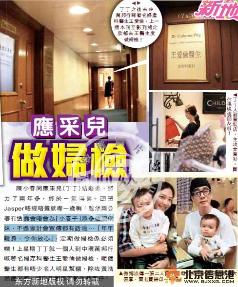应采儿素颜戴口罩现身街头  应采儿独自一人中环产检 陈小春和应采儿(丁丁)结婚后,努力了两年多, 终于怀了男宝宝。儿子囝囝转眼已经1岁了!两夫妇也透露会为儿子添一个妹妹,有人也说:“年年体检令人放心,定期做妇检是必须的”。应采儿上星期就独自一人到中环注明妇产科做妇检。据悉应采儿看的医生是很有名的为明星出诊的医生,除了帮黄浩然老婆检查,胡定欣也是这位医生的常客。 图文由新传媒集团合法授权使用,禁止任何形式转载。