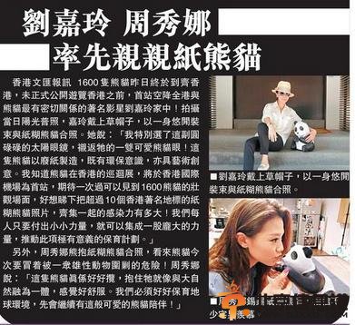 1600只纸熊猫亮相香港 据香港媒体报道,1600只熊猫昨日到齐香港,未正式公开游览香港之前,首站空降全港与熊猫最有密切关系的著名影星刘嘉玲家中!拍摄当日阳光普照,嘉玲戴上草帽子,以一身悠闲装束与纸糊熊猫合照。她讲:“我特别选了这副圆碌碌的太阳眼镜,衬一双可爱熊猫眼!这只熊猫以废纸制造,既有环保意识,亦具艺术创意。我知熊猫在香港的巡回展,将于香港国际机场为首站,期待一次过可以见到1600熊猫的壮观场面,好想看下把超过10个香港著名地标的纸糊熊猫照片,齐集一起的感染力有多大!我们每人只要付出小小力量,就可以集成一股庞大力量,推动此项极有意义的保护计划。” 另外,周秀娜熊抱纸糊熊猫合照,看来熊猫今次要冒着被一众雄性动物围剿的危险!周秀娜讲:“这只熊猫真是好好抱,抱住它就像与大自然融为一体,感觉好舒服。我们必须好好保护地球环境,先会继续有这般可爱的熊猫陪伴!”