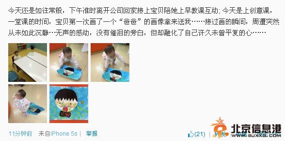 黄奕老公微博原文 据香港媒体报道,近日,黄奕撇下丈夫与女儿独自前往香港,并与一名何姓亿万富商见面,留港数日期间,富商一直陪伴左右,甚至旁若无人的一同进出四季酒店。据悉,该何姓富商做银器生意,跟赌王太太梁安琪私交甚好,身价过百亿,他与黄奕已来往了一段日子,二人不时在香港见面。 绯闻曝光后黄奕一直未发声,而黄奕老公今日多次更新微博,并晒出女儿早教课画作,写道“无声的感动,没有催泪的旁白,但却融化了自己许久未曾平复的心”,流露出爱女之心。 黄奕老公微博原文: 今天还是如往常般,下午准时离开公司回家接上宝贝陪她上早教课互动; 今天是上创意课,一堂课的时间,宝贝第一次画了一个“爸爸”的画像拿来送我……接过画的瞬间,周遭突然从未如此沉静…无声的感动,没有催泪的旁白,但却融化了自己许久未曾平复的心…… 去年底,黄奕与第二任丈夫富二代黄毅清在网上展开骂战,黄奕被男方指责不爱家,甚至经常打骂孩子,而之后,她又与丈夫和好,黄奕曾表示:“我不想拿家庭的事儿炒作,只想大事化小,小事化了。我们感情现在挺好的。”