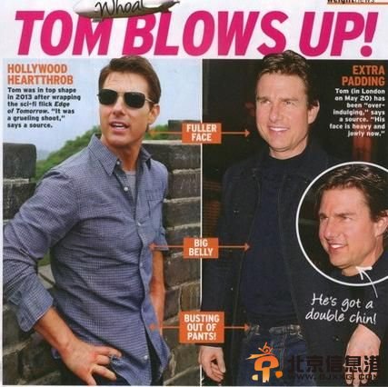 汤姆-克鲁斯发福照外流 据台湾媒体报道,“阿汤哥”汤姆·克鲁斯(Tom Cruise)在好莱坞叱咤多年,至今仍是人气红星,新作还在端午连假创下佳绩。不过,帅气形象深植人心的他,最近却被八卦周刊翻出变肥后,脸颊松垮、一笑就有双下巴,凸肚肥肉炸出牛仔裤的窘照,吓坏不少粉丝。 汤姆克鲁斯最近被《In Touch》周刊曝光了一张昔日帅气小生样,和发福后的对比照。图中变肥的他,虽然全身都被深色衣物包覆,脸颊却非常松垮,圆润的双下巴也清晰可见,就连肚子都看得出明显凸出,腰际还有部分肥肉挤在牛仔裤头,和过去精瘦结实的样相差甚大。 报导指出,汤姆克鲁斯发肥的照片经营养师目测推断,至少肥了25磅(约10公斤)。不过,51岁的他就算肥照外流,还是有粉丝认为以这个年纪来讲,偶像已经算保养很好了,况且人的外貌本来就会随年龄增长而有所变化;然而,也有网友对这讲法不以为意,认为明星维持良好体态系很理所应当的事。