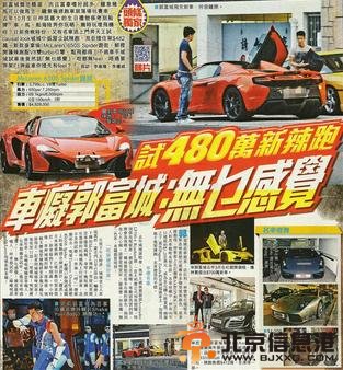 郭富城试480万新跑车 据香港媒体报道,郭富城舞功精湛,而且富豪嗜好超多,喜欢赌马可以做马主,喜欢极速跑车就落场玩赛车,去年10月生日还说最大的生日礼物试考到船牌,车、马、船海陆给你玩,几时玩飞机呀?日前傍晚时分,又有名车送上门给天王试,causal look城城试辣跑,见他架482万元、新款麦拿伦(McLaren)650S Spider上街,鲜橙开篷辣跑配V8双turbo引擎,怎么飞都可以!不过车手城城试车后竟然话“没什么感觉”,这样都无感觉,是不是要给架F1神级车你才有感觉?! 郭富城名车超多,法拉利、林宝坚尼样样有,单是林宝坚尼就拥有多个型号和颜色,组车队都得,还要套上自订靓牌AARON和K1NG等,人如其车都这么有型有款。名车珍藏中,还有06年以连税约1200万元、成为首位购入限量版“幽灵之子”黑色Pagani Zonda的亚洲超级车主,加其他十几架辣跑,名车总值约半亿。 半亿名车 去年城城演唱会,他还大晒林宝新款Aventador LP700-4 Roadster讲:“意大利总公司知我开唱,特地借出这架车,价值七百万。车厂说我买的话,将会为我喷上一种林宝坚尼从未出过的颜色,搞到我心大,想买不买好。”林宝,还有独一无二色系,有钱都买不到! 这架是好车 日前下午五时许,城城坐七人车返寓所,豪宅门口早已停泊一辆挂上T牌的McLaren辣跑,男经纪更开定车篷等城城,身著T恤短裤、背住黑袋的的城城马上行近新车,急不及待试开。一加油,“呼”一声绝尘而去。这架Tarocco Orange鲜橙色650S Spider,配备17秒开启或关上嘅电动折合硬顶设计。据悉3月嚟港展销,已吸引数位买家预订,新车最快下年到港。半小时后,车神城城回归,落地后,城城叉腰远望辣跑研究多几分钟先舍得走。问城城是不是买车?他笑笑说:“不是啦!我是喜欢车的人,什么车都喜欢试下。(开完有什么感觉?)……没什么感觉!喜欢车的人,什么车都试。”看来这部McLaren不是他的茶!