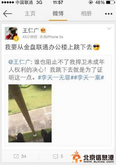 记者向该通信公司部门证实,该男子为哈尔滨人,是公司一名员工,在该公司工作10年,曾担任项目经理,现在是公司一名普通员工。对于今天跳楼的原因公司相关负责人表示不知为何。记者查阅其微博,内容显示当事人认为李某某无罪,要求释放。 阅读完标题为(海南男子微博直播跳楼 要求“释放李某某”(图))的文章后,{www.bjxxg.cn}小编为大家推荐更多相关文章,千万不要错过哦! (责任编辑:北京纪事)
