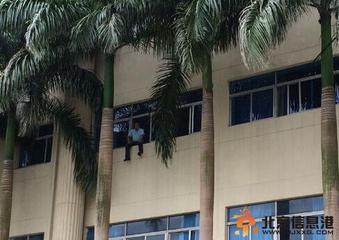 南海网海口6月13日消息 今天上午10点左右,在海南金盘某通信公司办公楼三楼,一男子爬上窗口欲跳楼,并在微博上直播自己将要跳楼。截止目前,公安,消防,救护车辆都已经在现场。