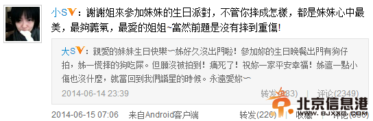 大S自曝摔个狗吃屎 6月14日晚,大S[在微博祝双子座的妹妹小S生日快乐,说自己出门参加妹妹生日遇狗仔跟拍,不小心摔了个“狗吃屎,但愿没被拍到!” 今天(15日)早晨,小S也微博回应大S:“谢谢姐来参加妹妹的生日派对,不管你摔成怎样,都是妹妹心中最美,最够义气,最爱的姐姐,当然前题是没有摔到重伤!”不少网友看到后赞她们姐妹情深,也有爱凑热闹的网友表示“无图无真相”。