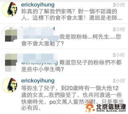 柯震东爸爸称曾经接受过儿子姐弟恋 近日,有消息传出,萧亚轩和柯震东相差12岁的姐弟恋宣告分手,随后,又爆出疑似柯震东“柯冲动”的私号在私密页面上发泄,而疑似萧亚轩的粉丝去柯震东爸爸的账号下留言质问甚至谩骂。6月15日,网友“Sunny雨濛”通过微博曝光柯爸爸和粉丝的互动留言,力挺儿子柯震东。 柯震东化名“柯冲动”狂数女生罪状 日前,脸书上有署名“柯冲动”的人在网上狂数一名女生的罪状,从蛛丝马迹的背景资料,柯震东疑似是“柯冲动”,这是他跟朋友的私密帐户。他的经纪人没确认“柯冲动”就是柯震东,却说漏了嘴,指他因情绪激动才在私密页面上发泄。间接证实了这帐号是柯震东的分身。“柯冲动”写道:“因为震动劈腿导致录悲歌无法完成……震动沟妹确定劈腿……好厉害!好厉害!我拍戏情绪失控怎么都没有记者知道呀?”还怒问对方要被劈腿的可怜人身份混多久? 柯爸护子称骂人事出有因 接受儿子姐弟恋不易 双方当事人没公开表态,但两边粉丝却吵得不可开交。6月15日下午,有网友曝光柯震东老爸在社交网站力挺儿子的对话。网友指责柯震东不应该用私号骂萧亚轩,而柯爸爸替儿子辩解,称:“男人有的是肩膀!不管外面的风雨!在私领域抱怨又什么不可!”随后又说“骂人当然不对,但事出必有因。”柯爸还颇无奈地透露儿子20岁时交往了大12岁的女友,身为家长自己也“接受了”,但表示从此儿子和萧亚轩将再无交集! 据报道,柯爸早前在面对记者询问与ELVA相关问题时,先是挥挥手表示不想谈。之后被问Tracy与ELVA哪个是父母比较喜欢的类型时?柯爸回应:“你们问的这个问题真的很贱!”看来柯爸是力挺儿子到底的势头。