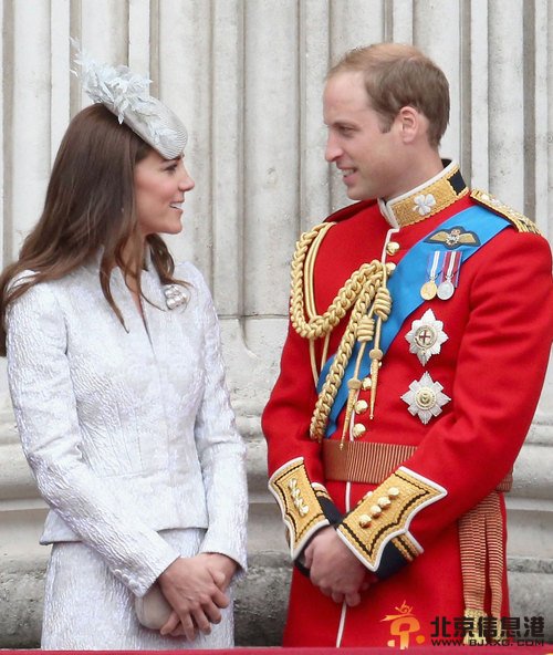 凯特王妃威廉王子对视甜蜜 英国皇室齐齐亮相白金汉宫,庆祝伊丽莎白女王二世的第八十八岁生日,凯特王妃与威廉王子相视微笑甜蜜,并不时与哈里王子说笑。