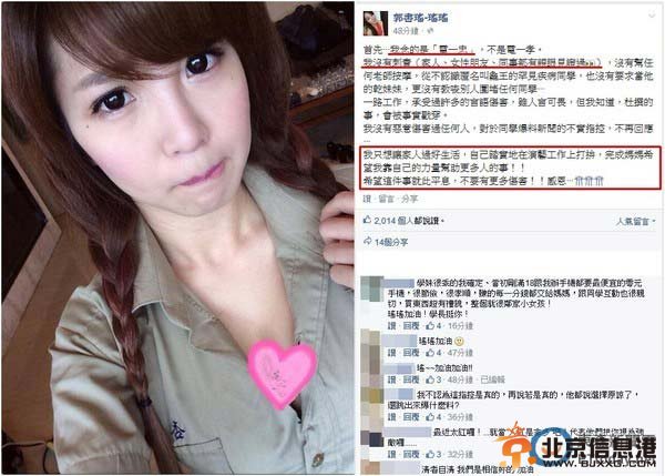网友“龟王”爆料郭书瑶欺凌同学 据台湾媒体报道,“瑶瑶”郭书瑶过去被网友“龟王”爆料,曾在校园对干癣症同学进行精神欺凌,爆料内容又被媒体挖出来引起一片哗然。而她稍早便在脸书亲自PO文,针对爆料内容讲出5点澄清,也忍不住哀叹出道以来受到很多言语伤害,直言“我只想踏实的在演艺工作上打拼”,希望风波可以早一点平息,不需要再有更多伤害。” 郭书瑶在澄清PO文中表示,在松山工农期间念的不是爆料称的“电一孝”;瑶瑶也说明包括家人、女性朋友甚至女同事在内,已有多人亲眼见证过根本没有“股沟刺青”。而上学期间,她也不曾为任何老师按摩,或是认识昵称“龟王”患有罕见疾病的同学并要求当对方的干妹妹,更不曾教唆他人围堵任何同学。 此外,郭书瑶坦言,出道以来确实受到不少言语伤害,也知道人言可畏,但始终深信“杜撰的事,会被事实戳穿。”而她也表示,从没有恶意伤害过任何人,也不会再回应爆料同学的不实指控,目前只求能让人过好生活、踏实地在工作上打拼,并“完成妈妈希望我靠自己的力量帮助更多人的事!”希望事件赶快落幕,不需要有更多伤害出现。网友留言力挺,也对她冷静处理、以德报怨的作风赞成誉有加,还有人激动地表示“怎么会有人想伤害这么贴心、孝顺的女生?” 不过,郭书瑶欺凌同学的爆料内容曝光后,还是有很多人持半信半疑的态度,甚至有人认为楼主的可信度很高,要求爆料者“龟王”应该当面和瑶瑶对质,才能把真相还原,各方看法不一。
