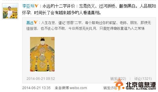 微博 6月21日凌晨,聂远突然发微博斥责老同学陈思诚:做人要厚道!虽然他随后很快删除了微博,但还是被手快的网友截了图。该条微博一时让人摸不着头脑,一向以温和形象示人的聂远为何如此高调的炮轰陈思诚?聂远的老婆跟佟丽娅是同学,有网友便猜测聂远在为佟丽娅打抱不平,而就在几天前陈思诚被拍到夜会嫩妹,被疑出轨。 陈思诚夜会嫩妹 佟丽娅自信御夫有术 6月16日,有媒体拍到陈思诚深夜密会长发妙龄女孩,当天在高档餐厅一起用餐四个小时,之后驱车前往陈思诚婚前的一处高级公寓,两人在公寓逗留了近两个小时,凌晨时分两人再度一起出门,并在路边开心地交谈,过马路跨越护栏时,陈思诚还搀扶了女孩的胳膊,让外界不禁猜想陈思诚有出轨的嫌疑。对此,陈思诚[微博]工作室回应称该女孩是陈思诚朋友的朋友,并称当天是为工作约见。 17日凌晨,正在看世界杯的佟丽娅发微博替老公澄清绯闻,自信有驭夫高招,称陈思诚吃饭见人必向自己报告,他去送朋友回家也不是什么大事。 聂远暗讽陈思诚衣冠禽兽 北爱编剧李亚玲补刀 6月21日凌晨远突然发微博斥责陈思诚:做人要厚道!随后21日9点52分再发一篇微博称“人生在世,谨记‘感恩’二字,每个帮助过你的前辈、老师、朋友,即使无缘报答,也不该心存不敬,今日所感无关风月,只是觉得尊师重道乃人之常情”,暗示陈思诚忘恩负义。同时,该条微博配了一张明代官员官服照,而明代官员的服饰规定:文官官服绣禽,武将官服绘兽,因此聂远疑似借此图讽陈思诚“衣冠禽兽”。 随后,与陈思诚闹翻的《北京爱情故事》编剧李亚玲转发聂远微博并评论道:“永远的十二字评价:忘恩负义、过河拆桥、颠倒黑白。人品就如怀孕,时间长了会有越来越多的人看清真相。” 陈思诚为“小三”庆生? 有网友曝料16日陈思诚夜会的女孩名叫张璇,是杨幂的同班同学兼室友。当天正是张璇的生日,她的一条朋友圈信息也被翻出来,“最幸福的一个生日,谢谢你能来”,疑似向陈思诚暧昧示爱。 公开资料显示张璇1988年6月16日出生于山东青岛,毕业于北京电影学院,2012年凭借情感剧《加油妈妈》、《幸福妈妈》系列女主角而获得关注。