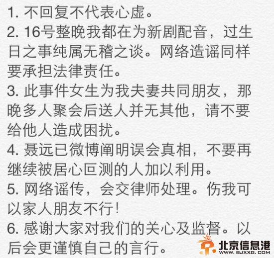 陈思诚在录音室照片 近日,有媒体称陈思诚夜会女友人并被拍到搀扶对方。而随后又有爆料称那个女孩本名叫张璇,是一个小演员,16号是她的生日,而陈思诚当天去她寓所就是为了给她庆生,根本不是工作。据传,两人认识很久了。随后,演员聂远和北爱编剧李亚玲也开始“炮轰”陈思诚了!不过作为陈思诚老婆的佟丽娅而后也在微博上替老公再度澄清绯闻,称知道陈思诚当天送人了,同时否认其与女性有人有亲密接触。而在6月22日,陈思诚通过微博发表了一份声明,阐述了整个事件的缘由,表示次时间纯属网络造谣,并声称会交律师处理此次事件。 微博原文如下: 1.不回复不代表心虚。 2.16号整晚我都在为新剧配音,过生日之事纯属无稽之谈。网络造谣同样要承担法律责任。 3.此事件女生为我夫妻共同朋友,那晚多人聚会后送人并无其他,请不要给他人造成困扰。 4.聂远已微博阐明误会真相,不要在继续被居心叵测的人加以利用。 5.网络谣传,会交律师处理。伤我可以家人朋友不行! 6.感谢大家对我们的关心及监督。以后会更谨慎自己的言行。
