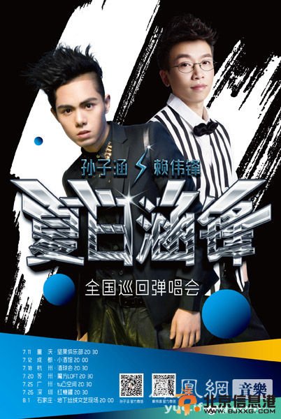 夏日涵锋巡回演出海报 简单快乐“夏日涵锋”全国Live House音乐巡演将于7月初正式开启。此次巡演计划,将由旗下艺人90后超人气偶像创作型歌手孙子涵携手同门师兄新锐音乐人赖伟锋孙首次联手挑战现场弹唱,在全国7个城市用音乐与大家见面。“夏日涵锋”全国Live House巡演计划,亦将是他们真正意义上的第一次音乐行走。 在此次即将开启的“夏日涵锋”全国巡演中,孙子涵与赖伟锋会现场他弹唱的方式,对各自的代表作品重新编曲和演唱,卸去华丽包装和偶像包袱,与大家零距离,在16首歌一首接一首弹唱的90分钟里,音乐最真实的魅力走进人心。据悉,对于此次“夏日涵锋”全国Live House全国巡演计划,孙子涵与赖伟锋更大胆说出口号,表示这一次他们就是要来真的! 被称为“热血小超人”孙子涵,今年才刚刚大学毕业,出道四年却已先后发行了《一年一度的夏天》、《毕业声》、《最近还好么》及《涵剧先森》等四张个人专辑,并在互联网取得高达7亿人次视听点击率的好成绩,年纪轻轻已拥有近百万级粉丝,新声可谓。而在今年3月刚刚成功发表首张个人国语专辑《男朋女友》的新晋歌手Sam赖伟锋,不仅因曲风温暖、熨帖,广受大家喜爱,因为被大家封为“音乐疗愈师”,在2012年末,Sam赖伟锋曾凭借其发表的《闹够了没有》,得到了单曲全网试听突破3亿人次的惊人成绩,被网友奉为“备胎金曲”,展现了自己无限上升的音乐潜力。孙子涵与赖伟锋,这两位风格截然不同的音乐人,当热血遇上疗愈系,不知道会在这个暑期迸发出怎样的火花,带给大家怎么样的惊喜呢?让我们拭目以待。