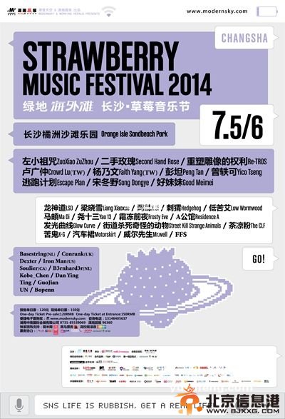 长沙草莓音乐节攻略海报 长沙是一座极具娱乐气质的城市,正如“草莓音乐节”创办人沈黎晖在新闻发布会上说的那样,“草莓音乐节将首次进驻长沙,长沙是一座极具娱乐魅力的城市,我们希望草莓的进驻除了给长沙再增添一份娱乐魅力之外,更增加一份更专业的音乐性。”2014绿地海外滩长沙草莓音乐节大幕将启,那些欢笑与泪水、精彩和火爆的场面还将继续。 7月5-6日,2014首届绿地海外滩长沙草莓音乐节将在橘洲沙滩乐园举行。此次绿地海外滩长沙草莓音乐节由摩登天空和潇湘晨报联合主办,中南国际会展有限公司、FM89.3汽车音乐电台共同承办。为期两天的长沙草莓音乐节设置草莓舞台、长安新奔奔•爱舞台、MAE电子舞台,近40组国内及台湾地区音乐人参演。草莓生活馆、Modernsky LAB、搭讪广场等草莓音乐节特有体验同时进驻,娱乐之都长沙将迎来一场最专业最精彩的音乐现场。 一、长沙草莓音乐节这么看 2014绿地海外滩长沙草莓音乐节草莓舞台可谓集合了国内多位顶尖音乐人和乐队,摇滚师左小祖咒与最妖娆最民族二手玫瑰乐队的加盟无疑最具看点,他们将分别压轴两天的演出。逃跑计划、彭坦等国内摇滚中坚力量将有望献唱金曲。来自台湾的音乐鬼才卢广仲和摇滚女神杨乃文同样极具看点。人气偶像长沙制造,长沙无疑是曾轶可的主场,时隔多年,自信成熟的曾哥你不应该错过。一把吉他一个人,宋冬野与《董小姐》在长沙将发生什么样的故事?现场见分晓。阿肆、刺猬、低苦艾、苦鬼、茶凉粉、汽车裙等乐队和艺人也将登陆草莓舞台。 长安新奔奔•爱舞台则集合了后朋、雷鬼、民谣、金属、后摇等多种音乐风格的音乐人和乐队参演,重塑雕像的权利、龙神道、梁晓雪、好妹妹、马頔、尧十三等艺人和乐队将陆续登台。MAE电子舞台邀请到多国电音大咖,Basestring、Conrank、Iron Man、Dexter、Soulier、B3rnhard3r等会轮番登台,把你带入最狂热的电音氛围,注意你的情绪,适时释放,长沙草莓音乐节你要嗨起来! 二、请买票进场 支持音乐产业良性发展,拒绝无理由蹭票,请自觉购买门票!2014绿地海外滩长沙草莓音乐设置了多种购票选择和方式: 预售早鸟票:180元/2日(已售罄) 预售单日票:120元 现场单日票:150元 Early bird Two-day Pass:180RMB(Sold out) One-day Ticket Pre-sale:120RMB One-day Ticket at Entrance:150RMB 便捷电子票购买www.modernsky.com 咨询电话:010-5876 0181(分机6034) 湖南中南国际会展有限公司0731-85539069 潇湘晨报96360 绿地海外滩8989 7888 绿地中心8993 8888 绿地之窗8857 9999 绿地香树花城8993 6888 湖南票务网400-677-9898 贺龙馆售票处0731-85158555 大麦网400-610-3721 仟吉西饼湖南所有门店 中国售票网400-700-4430 创杰文化0731-82220509 中国电信114 三、零距离接触 绿地海外滩长沙草莓音乐节将设置签售区,多位参演艺人和乐队将举办签售活动。刺猬、梁晓雪、左小祖咒、阿肆、低苦艾、宋冬野、彭坦、二手玫瑰将在演出结束后去往签售区举办签售活动,这是一次与偶像零距离接触的好机会,机不可失,失不再来。参与签售活动的观众和乐迷朋友请注意有序排队,切勿插队给别人带来不便。详细签售时间如下: 7月5日 17:00-17:20 刺猬 20:10-20:20 梁晓雪 22:50-23:10 左小祖咒 7月6日 15:50-16:10 阿肆 17:00-17:10 低苦艾 18:10-18:30 宋冬野 21:10-21:30 彭坦 22:50-23:10 二手玫瑰 四、特色环节和创意市集 众所周知,草莓音乐节有多项特色版块,搭讪广场、Modernsky LAB、草莓生活馆,这些最纯正的“草莓”体验将出现在长沙草莓音乐节现场,给你最舒适最有趣的音乐节之旅。不管是写诗还是画画,千万别那么直白,浪漫的邂逅总在诗情画意之后,请努力搭讪,或许从此你的人生将发生些改变,搭讪广场等你来。Modernsky LAB多款潮T助你帅气的度过这个夏天。草莓生活馆每天4组嘉宾,为你讲述他们最真实、最具创意、最新潮的生活和工作方式。怎么样?这些精彩演出外的草莓特色版块是不是足够吸引你? 绿地海外滩长沙草莓音乐节不仅可以看到各类大牌艺人和乐队的演出,还可以选购创意产品。到场乐迷朋友可以在创意市集里来淘淘宝,说不定会找到惊喜哦。这次创意市集设置了不少展台,手工布艺、创意衬衫、CD、面具等各类物品都会在创意市集出现。 五、交通有管制低碳更省心 草莓音乐节一直提倡低碳环保,因此在交通方面,强烈建议乐迷乘坐公共交通工具出行。 特别提示:7月5日、6日当天,橘子洲大桥南北支桥将进行管制,只允许公交车、执行任务的特种车辆以及持有草莓音乐节组委会发放的证件才能下桥,无证一律无法下桥,请大家乘坐公交或地铁出行; 如果大家是自驾来橘洲的话,可将车停在沿江两侧停车带的停车位上步行进入景区,或是将车停在地铁站口周边区域,搭乘地铁前往景区。 长沙地铁2号线停靠站: 1、望城坡站:望城坡大市场、汽车西站【西二环】 2、金星路站:湖南财经高等专科学校 3、西湖公园站:省人防办、湖南大学北门 4、溁湾镇站:岳麓山风景名胜区、新民学会旧址、通程商业广场 5、橘子洲站:橘子洲公园 7、五一广场站:五广场、黄兴路步行街、王府井百货 8、芙蓉广场站:芙蓉广场、劳动局 9、迎宾路口站:市十二、韭菜园 10、袁家岭站:新华书店、省委 11、长沙火车站:长沙火车站、晓园公园 12、锦泰广场站:锦泰广场、电信大楼【东二环】 13、万家丽广场站:万家丽建材家居市场、东方家园 14、人